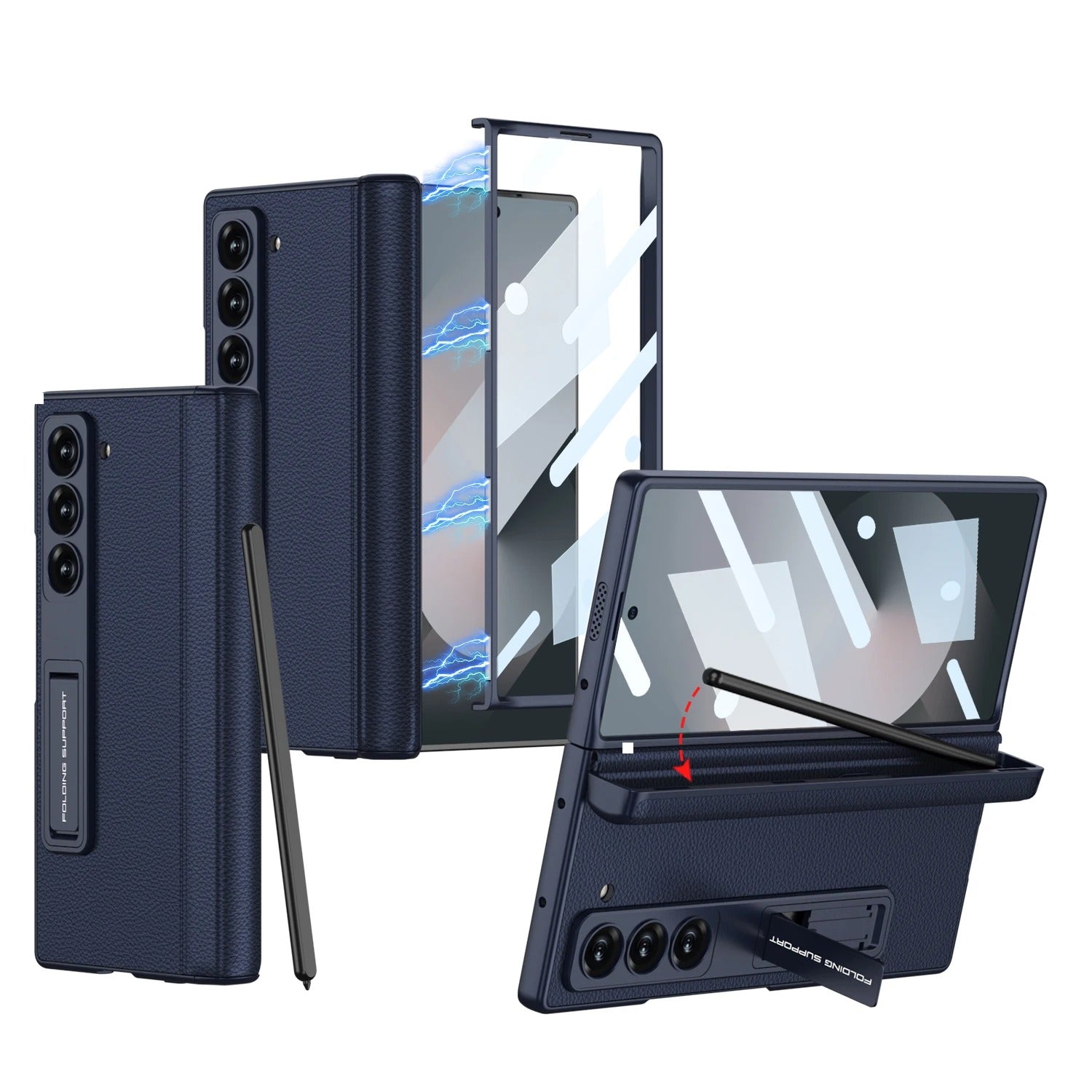 The Magneto® - Leather Pen Box Case with Screen Protector provides premium protection and versatile functionality for Samsung Galaxy Z Fold 7, 6, 5, 4, and 3. Made with high-quality leather, it features a magnetic pen box for secure stylus storage, shockproof design for durability, and an integrated screen glass protector for 360° device security. Ideal for both professional and everyday use.