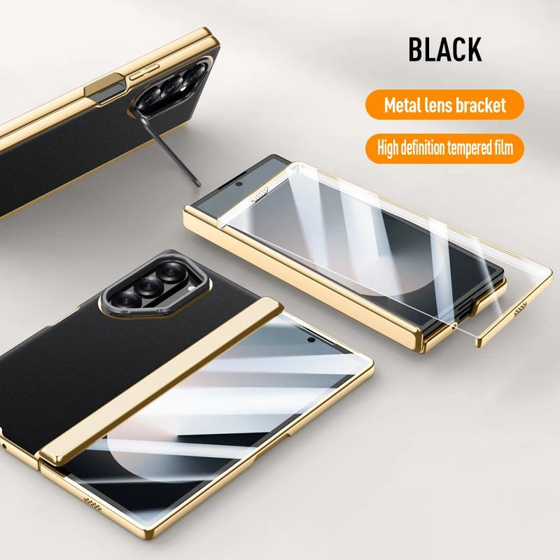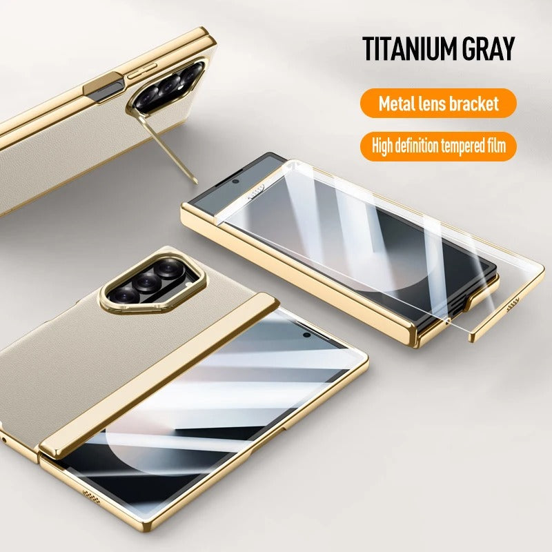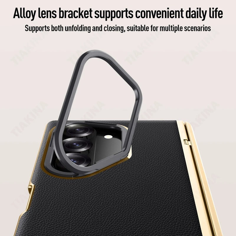 Luxurious Galaxy Z Fold 7 case with a golden frame, premium leather finish, hinge protection, and a built-in screen protector. Complete with a metal camera stand, this case combines elegance and full-body protection for your device.